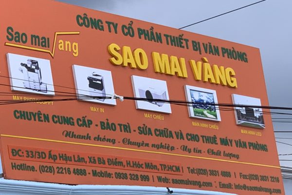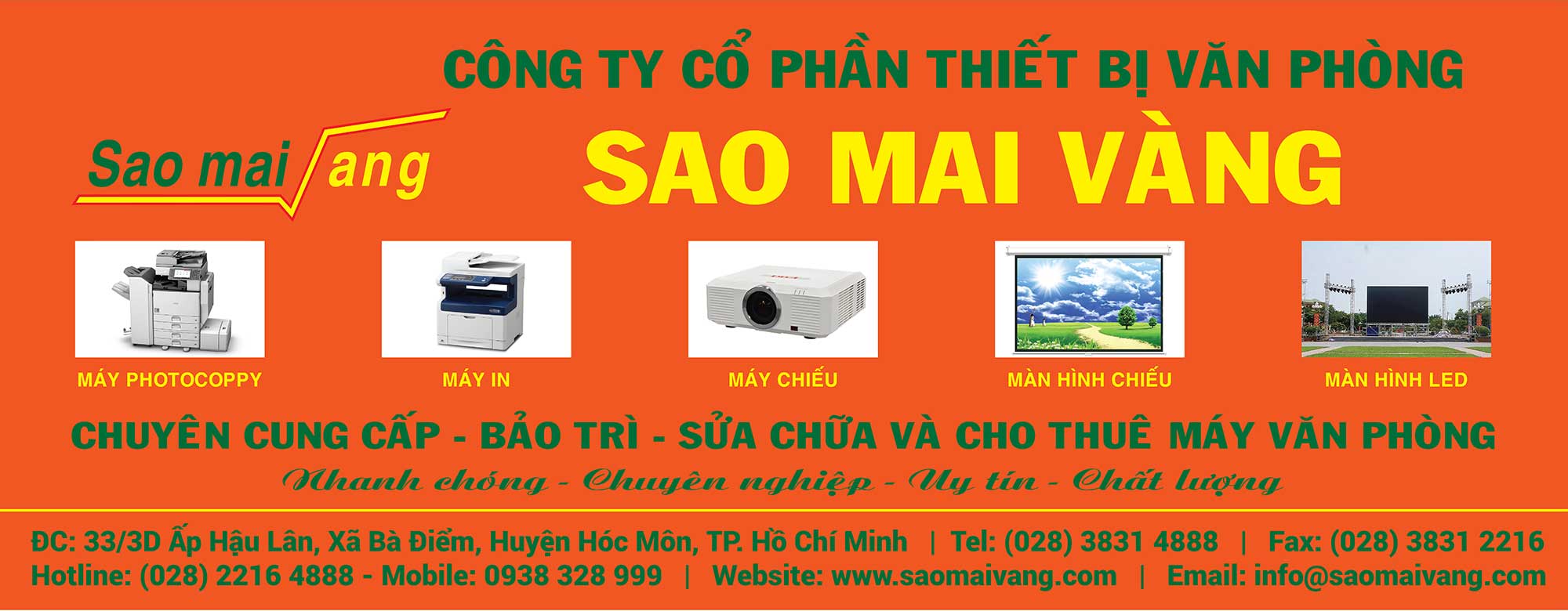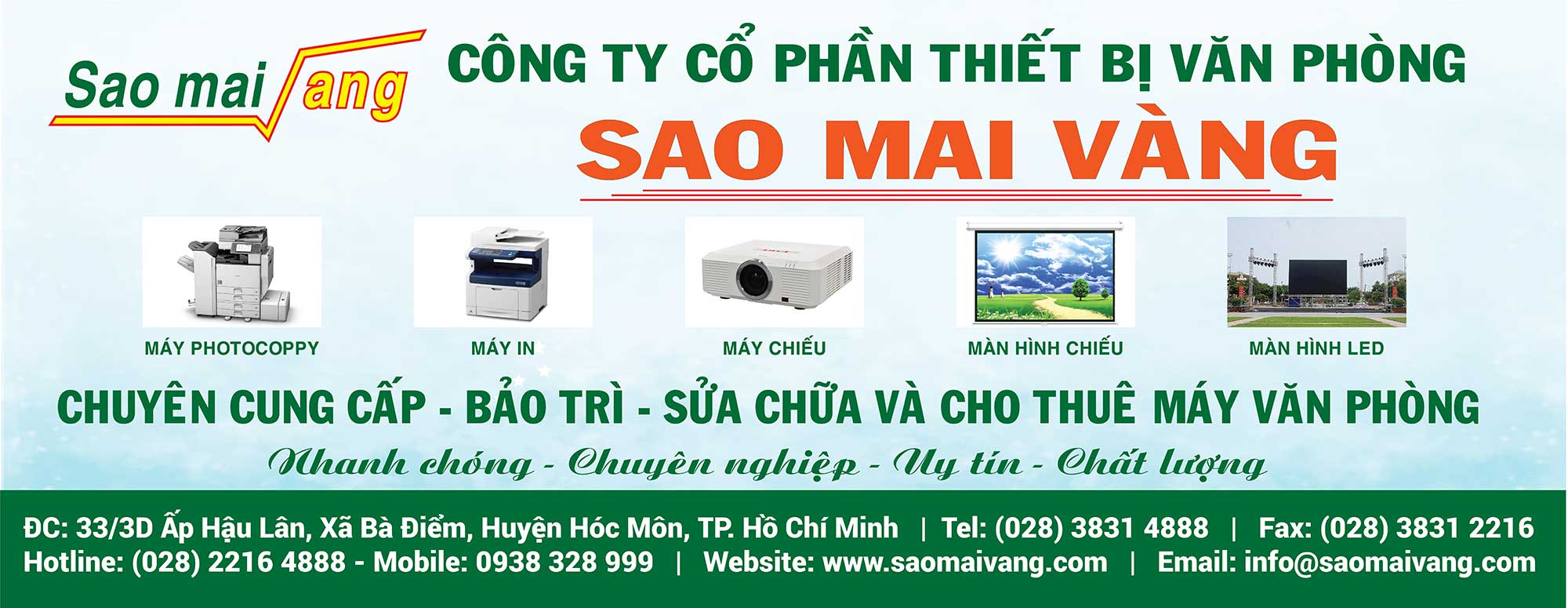 Công ty CP Thiết bị Văn phòng SAO MAI VÀNG là một trong những Công ty chuyên cung cấp, bảo trì, sửa chữa và cho thuê máy thiết bị văn phòng hàng đầu tại Tp. HCM. Cụ thể là máy Photocopy, máy chiếu, màn hình chiếu, máy in, màn hình LED, màn hình tương tác thông minh, … Với mong được mang đến cho Quý khách hàng giải pháp tốt nhất và tối ưu nhất. Vui lòng gọi cho chúng tôi vào số Hotline để được phục vụ tận tình và chu đáo.